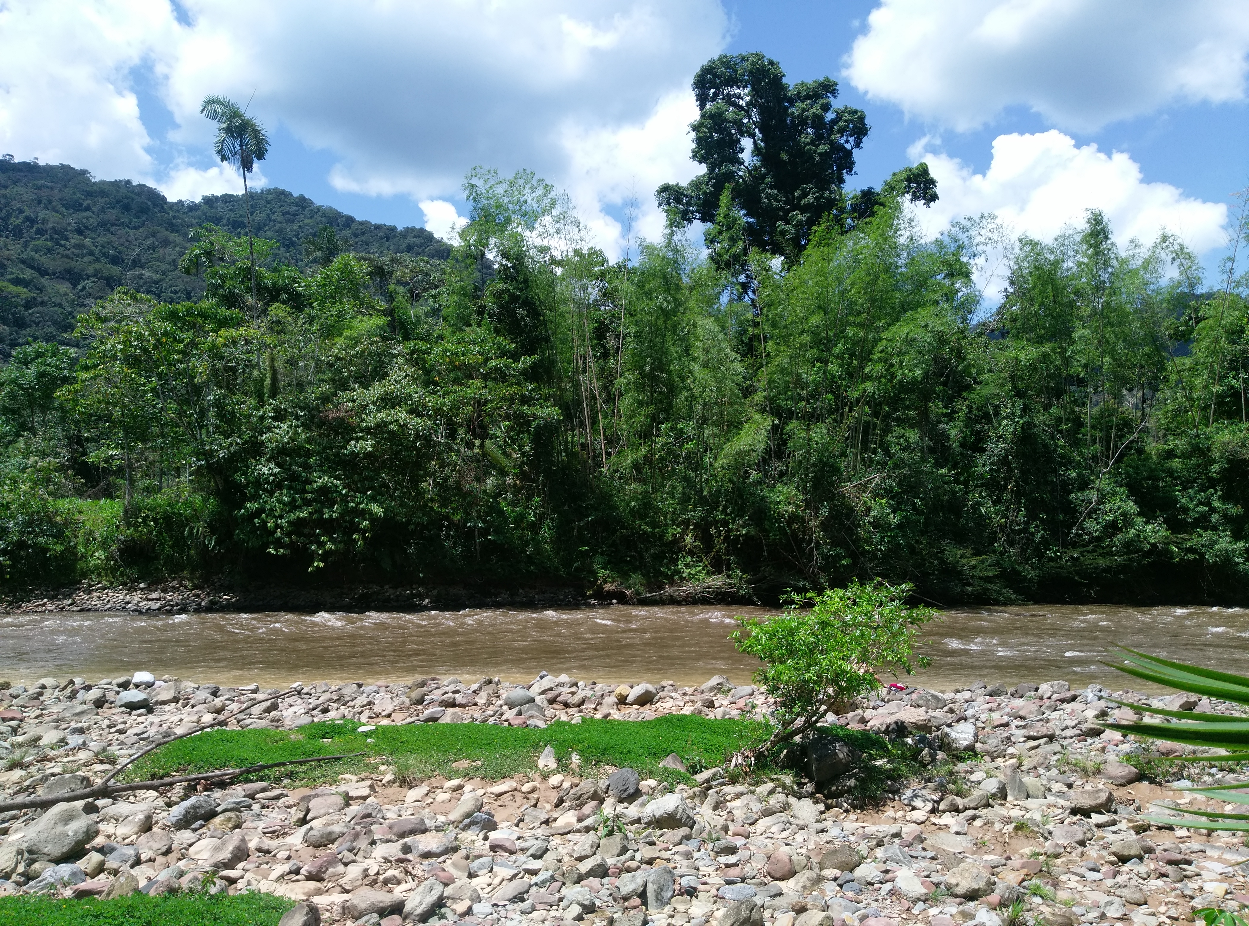Für das Vorhaben bekam ich Gummistiefel ausgeliehen, die ich dafür sehr gut gebrauchen konnte. Zuerst liefen wir ein kleines Stück an der Dschungelstraße, wie ich sie nenne, entlang. Dann gings es bereits seitwärts durch ein kleines Stück dicht bewachsenen Wald. Dieser endete mit einer nicht sehr stabil aussehenden Brücke über einen kleinen Bach, die uns jedoch alle aushielt. Ein kleines Stück weiter und wir waren am Bach. Dort zog ich mir eine kurze Hose an, meine Socken aus und meinen Beutel trug ich überm Kopf, denn nun ging es durch den Fluss auf die andere Seite. Das war schon ein komisches Gefühl, sich mit Gummistiefeln durch fast hüfthohes Wasser zu kämpfen, und versuchen nicht hinzufallen, was mir 2 / 3 Mal beinahe passiert wäre, denn dank Strömung und unvorhergesehenen großen Steinen war das ganze nicht so einfach. Dann landeten wir bei der der Minga, deren Ziel es war eine Fläche am Fluss freizulegen, damit die Familie dort Yuca anbauen kann. Ich bekam also eine Machete in die Hand gedrückt und fällte ein paar dünne Bäume, was gar nicht so einfach war, wenn man noch keine Technik beherrscht und die Hände daran nicht gewöhnt sind. Deswegen bekam ich auch prompt Blasen an meiner rechten Hand. Auch habe ich mir in die Hand geschnitten, jedoch nicht mit der Machete sondern an einem Bambusbaum, den ich gerade halbierte. Aber das war nicht weiter schlimm, denn dank meinen offenen Blasen konnte ich sowieso keine Machete mehr schwingen. Kurz vor dem Mittagessen, wurden dann noch stehende Bambuspflanzen angeschlagen, sodass die Kammern freilagen, in denen sich Wasser befand, welches wir durch einen schnell gebastelten Bambusstrohhalm trinken konnten. Das dringend benötigte Bad im Fluss nach diesem sehr warmen und anstrengenden Tag war super angenehm!