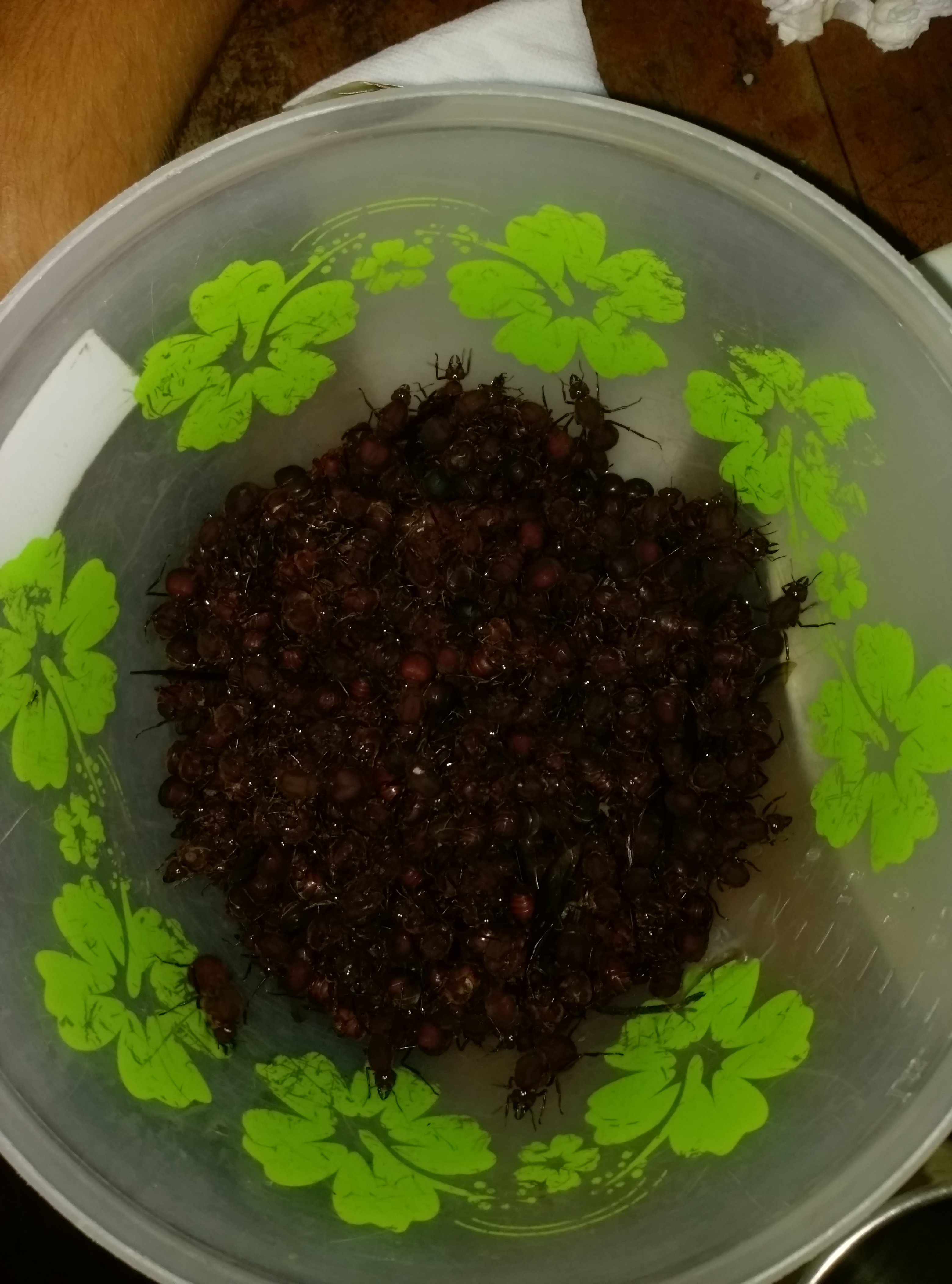 Am Sonntag ging es dann wieder zurück in den Dschungel. Zurück in der Schule passierte mir direkt etwas sehr witziges. Ich unterrichtete gerade spontan eine Klasse mit etwas jüngeren Schülern, als mir ein Schüler plötzlich vier riesige Insekten, die aussahen wie übergroße rostbraune Fliegen, auf die Hand legte und meinte, die sind zum Essen. Ich guckte ihn nur etwas ahnungslos an, denn die Tiere liefen noch munter auf meiner Hand herum. Deswegen zeigten mir die Kleinen dann eifrig, wie man sie isst. Abends im Dorf erfuhr ich dann, dass das Ameisenköniginnen waren, die nur für eine kurze Zeit jedes Jahr herauskommen und hier eine Delikatesse sind. Deswegen half ich dann im Dunkeln um die Küche herum Ameisenköniginnen zu sammeln, von denen wir auch einige zusammenbekamen. Diese wurden dann mit Öl und Salz frittiert, sodass sie meiner Meinung nach nach salzigem Popcorn geschmeckt haben, und man sehr leicht vergaß, dass man gerade Ameisen aß.