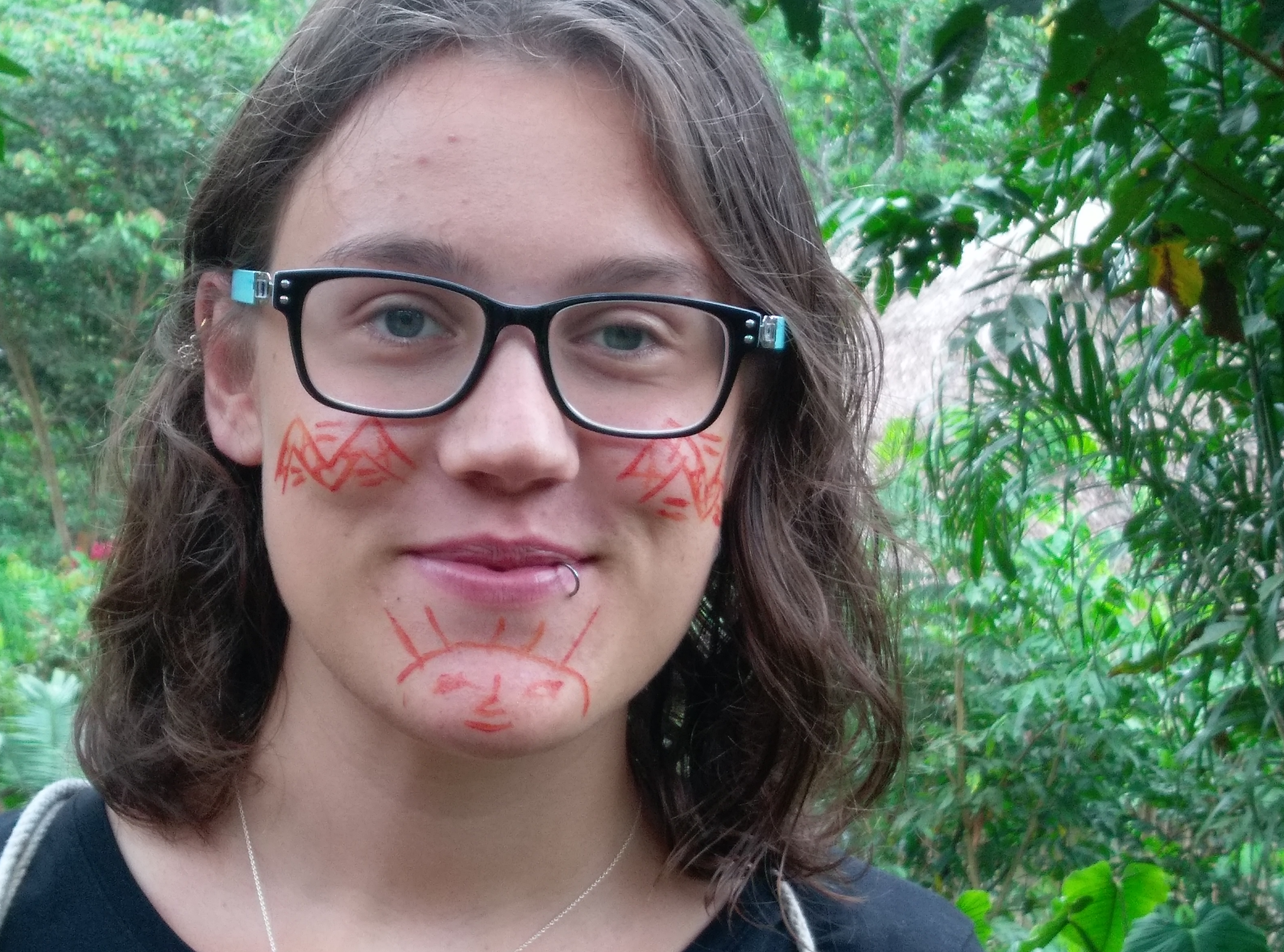 Also we have done the trip to the near waterfalls. For that we got a personalized face-painting with the color of a certain plant and then we started walking up the little river, as well as we went through deeper parts of the jungle. In this part of the trip I felt like I was in another world because it was so idyllic and untouched by mankind. At the first waterfall we left the things that weren’t supposed to get wet and climbed up that waterfall in swim suits and rain boots. After that we walked through knee-high water up to the second waterfall with a deep pond in front of it, where we could go swimming. I liked this trip very much, because the walk there and of course the waterfalls were beautiful.