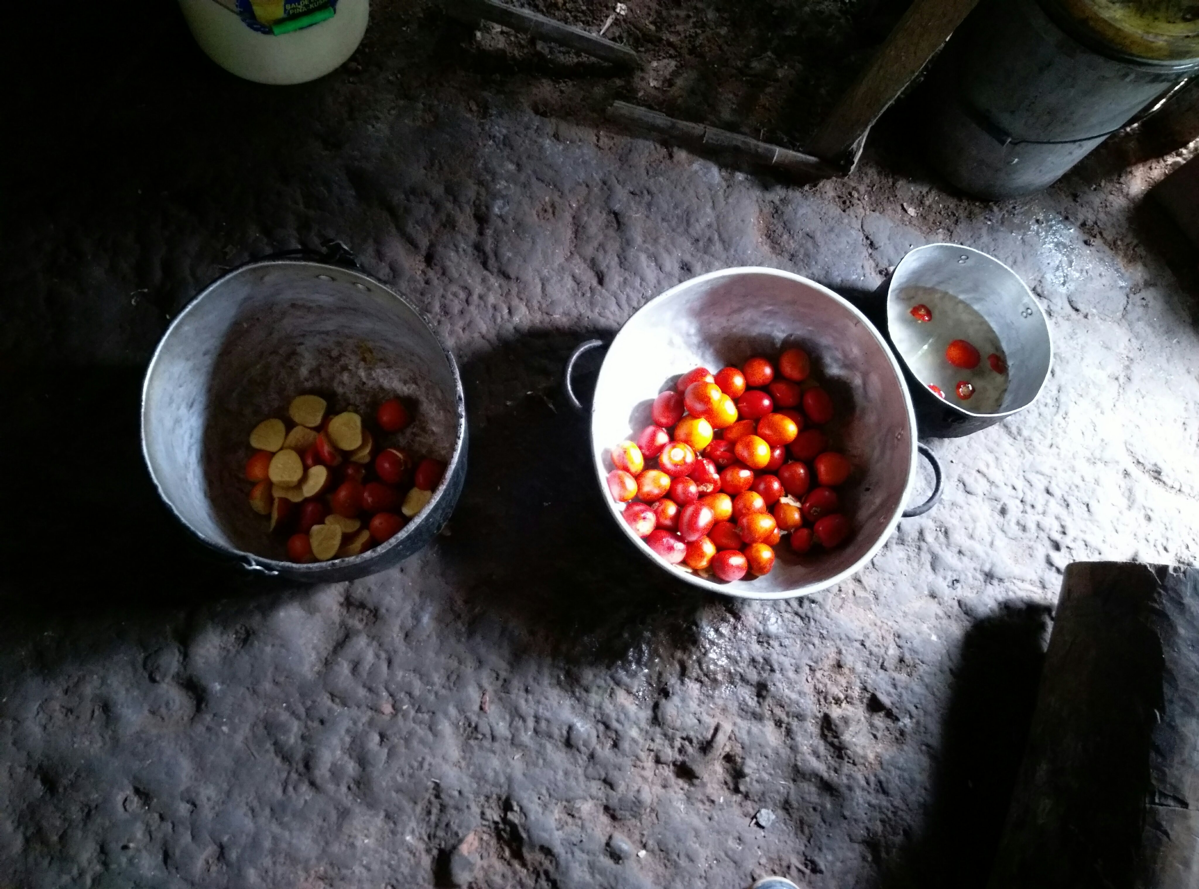 Because we harvested on the other side of the river, as I mentioned in my last entry, we had a lot of naranjillas, which I made juice out of a few days later. To make juice I haf to wash the fruits, cut off the top and then half them. The halves were cooked for about 20 minutes in a pot filled with water on the fire. After it had cooled down, Cesar mashed up the cooked fruits. The last step was adding a bit of sugar, because naranjillas are very sour and then the homemade and very delicious juice was done.