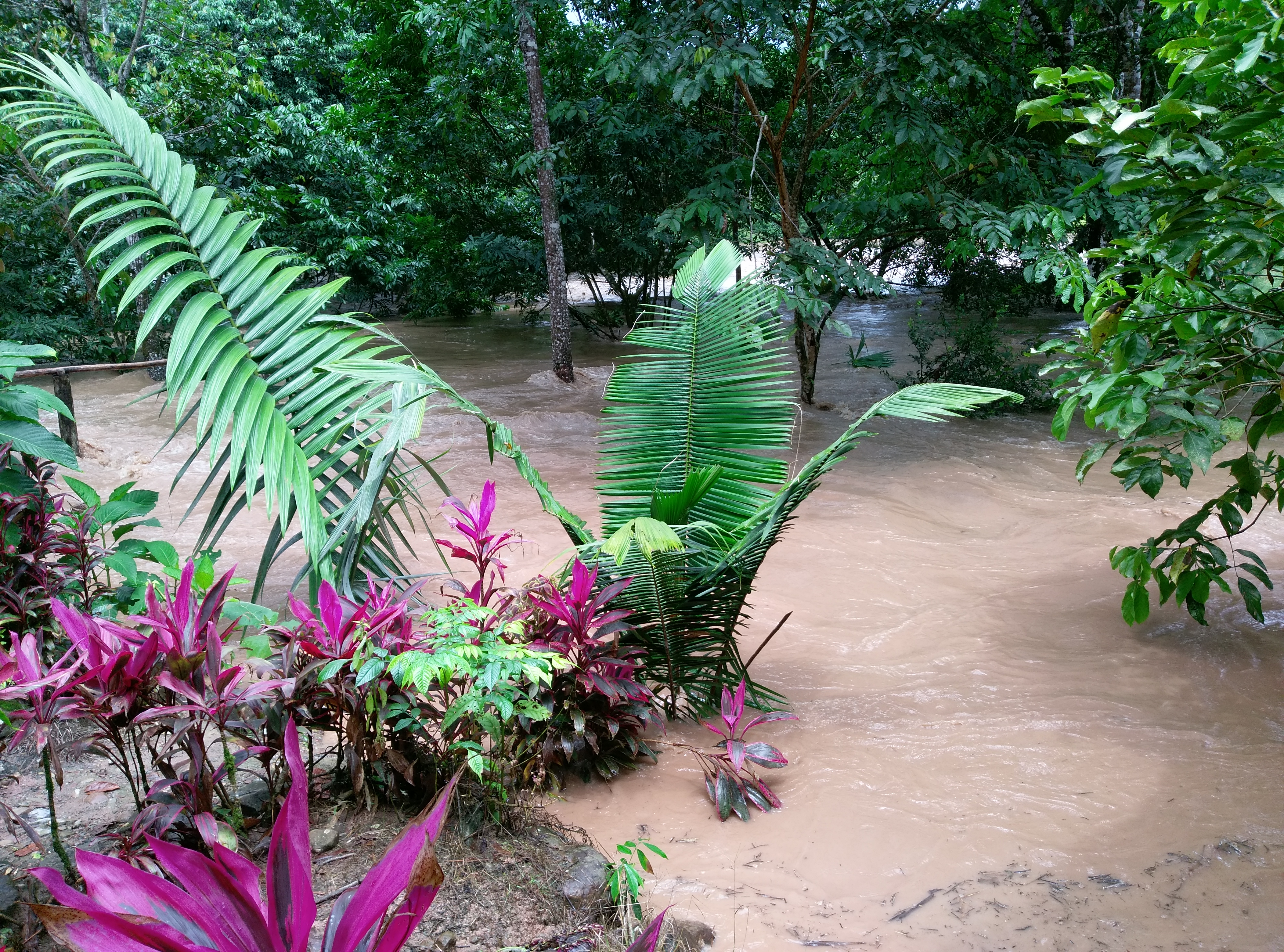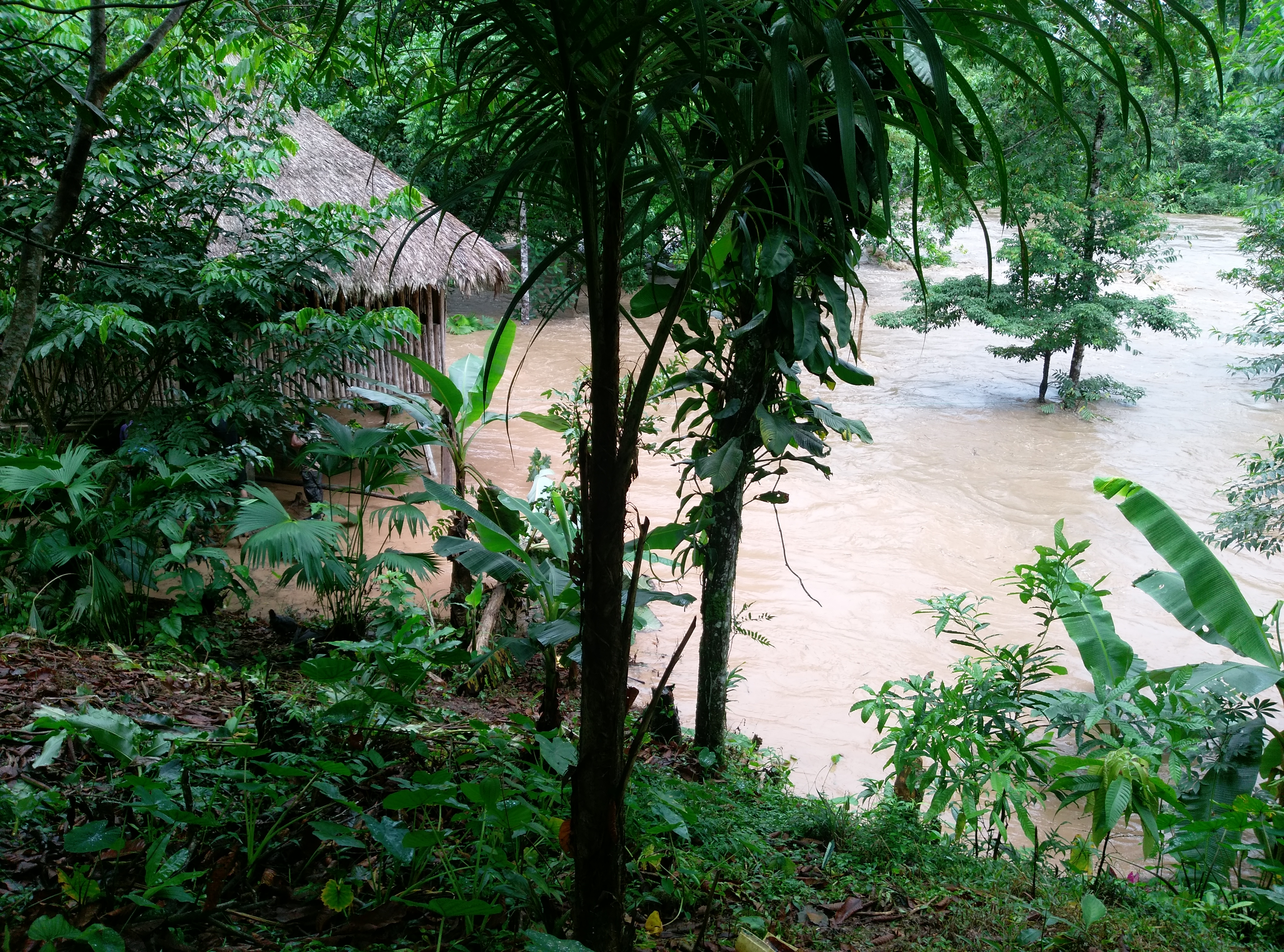 Letzten Mittwoch wurde ich bereits nachts vom starken Regen wach, weil es so laut war. Morgens regnete es zwar nicht mehr, aber sowohl der kleine (Rio Colorado) als auch der große Fluss (Rio Macuma) waren sehr voll und vor allem dreckig. Nach dem Frühstück sind Sven und ich wie immer losgelaufen, jedoch es kurz darauf an heftigst zu regnen. Zum Glück waren wir nahe an einer Hütte, wo wir uns unterstellen konnten, denn die nächsten 2,5 Stunden hörte es nicht mehr auf zu regnen. In die Schule kamen wir an dem Tag nicht mehr, da unser regulärer Bus nicht anhielt und der nächste Bus, wahrscheinlich wegen dem Regen, gar nicht kam. Als es dann endlich nur noch nieselte, gingen wir zurück ins Dorf. Dabei konnte man schon auf dem Weg beide Flüsse sehr laut hören und sie sogar sehen, was kein gutes Zeichen war. Im Dorf angekommen sahen wir dann auch direkt, dass beide Flüsse über die Ufer getreten waren. Etwa eine halbe Stunde später wurde ich dann von Tunti gerufen, dass ich helfen sollte. Als ich aus meiner Hütte kam, sah ich auch direkt, womit.