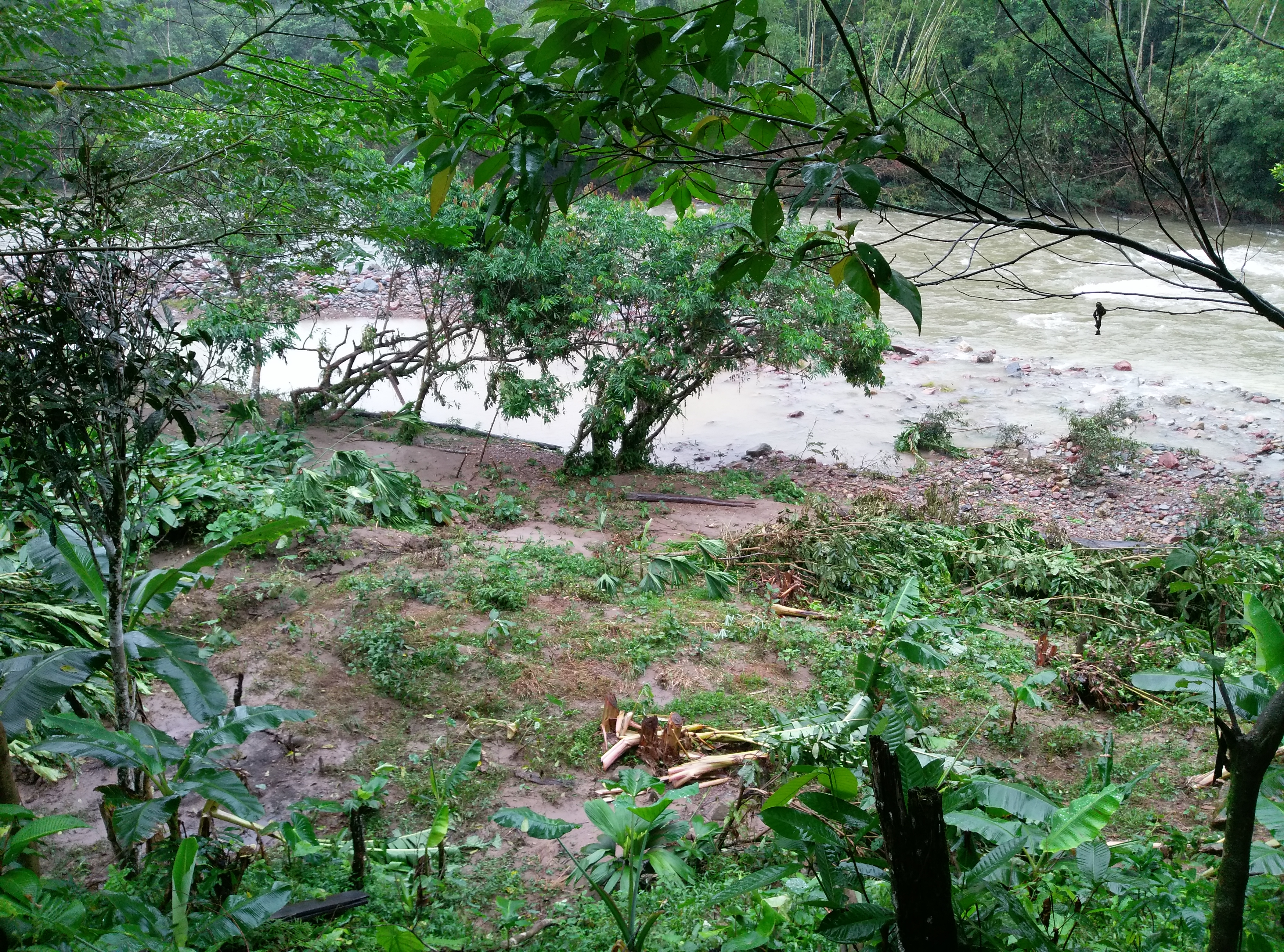 Bereits am Abend war der Wasserspiegel schon fast wieder normal und man konnte die Zerstörung sehen, die die Flut hinterlassen hat. Eigentlich alle Platano-Palmen und Yucapflanzen, sowie einige Bäume wurden weggeschwemmt. Und auf der anderen Seite des Flusses, wo unsere Felder sind, wurde auch fast alles mitgerissen.